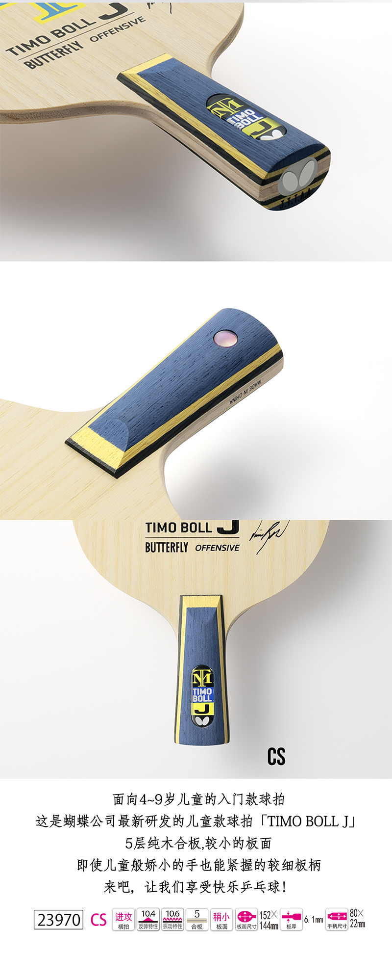Butterfly蝴蝶23980 TIMO BOLL TJ-CS乒乓球碳素底板 兒童輕量進(jìn)階球拍