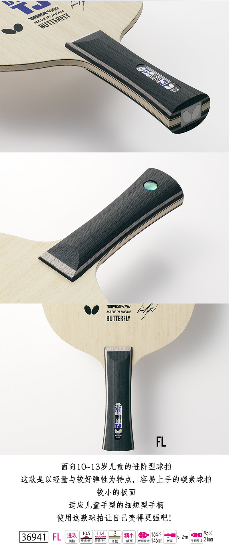 Butterfly蝴蝶36931 TIMO BOLL J-FL乒乓球純木底板 橫拍 重量輕,板面小 適合兒童的細(xì)型手柄