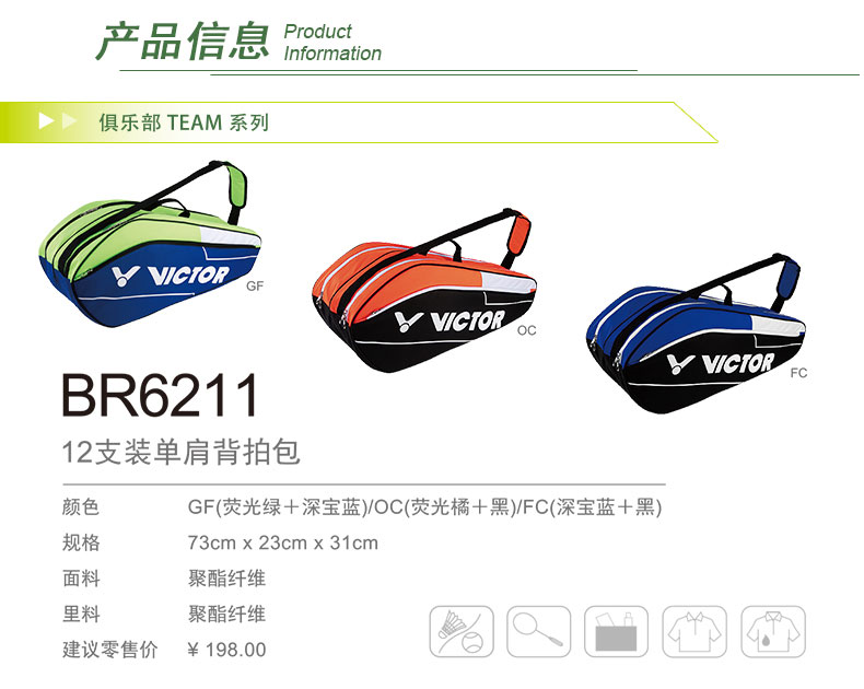 威克多羽毛球拍包12支裝單肩背包俱樂部系列 BR6211